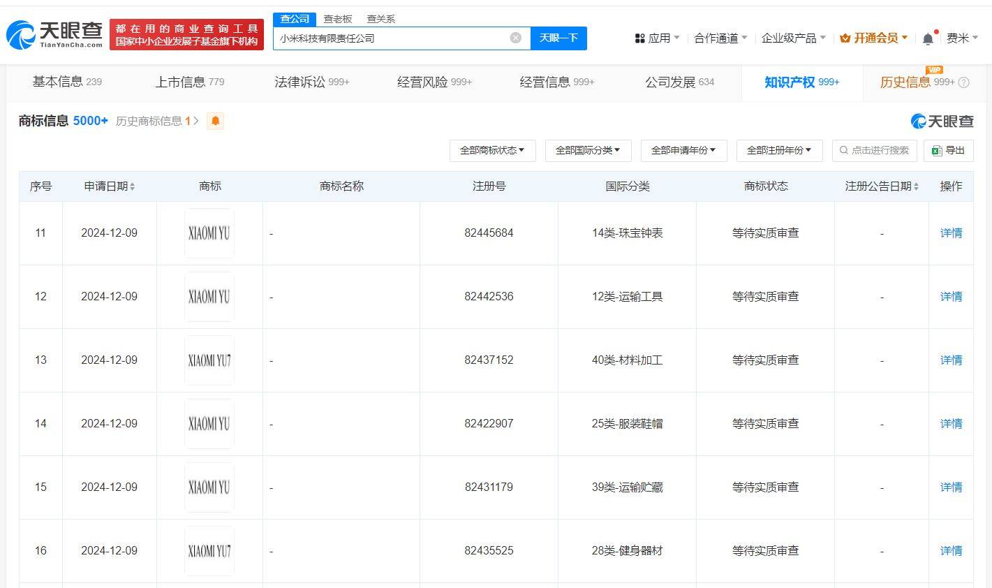 近期,小米科技有限责任公司在知识产权领域有了新动向,据天眼查平台披露的信息,该公司已正式提交了多个“XIAOMI YU7”及“XIAOMI YU”商标的注册申请。这些商标的国际分类广泛,涵盖了运输贮藏、运输工具以及科学仪器等多个领域,目前均处于等待实质审查的阶段。